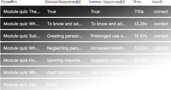 View exactly where a learner is up to in their course, their responses, time spent and more.